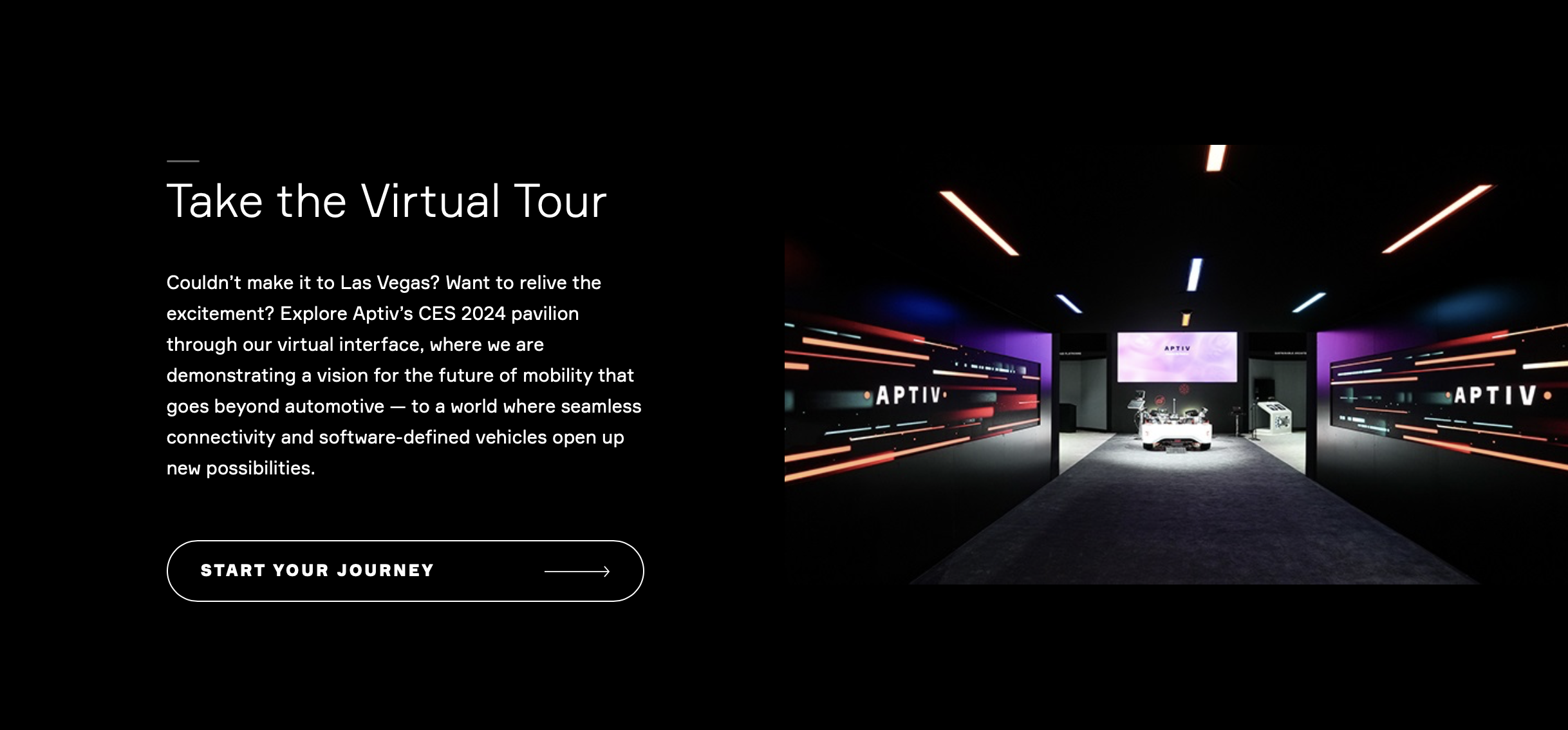 Couldn’t make it to Las Vegas? Want to relive the excitement? Explore Aptiv’s CES 2024 pavilion through our virtual interface, where we are demonstrating a vision for the future of mobility that goes beyond automotive — to a world where seamless connectivity and software-defined vehicles open up new possibilities.